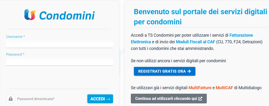 Aperta la pagina di TS Condomini, per i clienti che utilizzavano Multifatture effettuare la prima registrazione cliccando su sul link: Continua ad utilizzarli cliccando qui