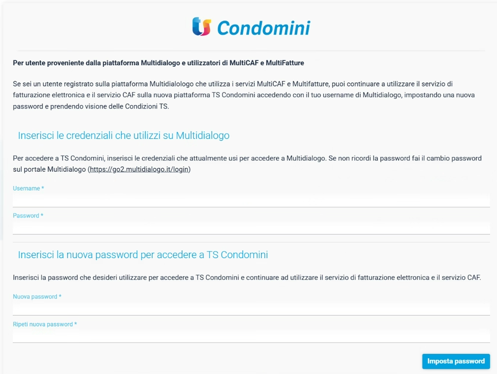 Dalla successiva finestra inserire Username e Password dell’account di Multifatture, la nuova password da utilizzare per il servizio TS Condomini Fatture e infine su Imposta password.