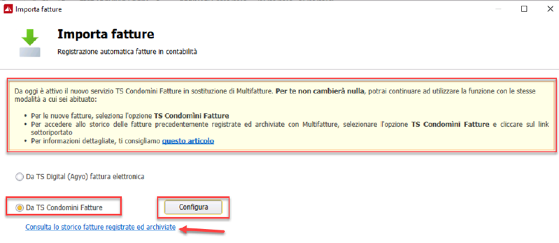 Nella finestra che si apre scegliere l’opzione “Da TS Condomìni Fatture” e cliccare sul pulsante Configura.