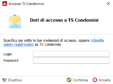 Se è stata già fatta la registrazione alla piattaforma TS Condomìni è sufficiente indicare le credenziali (Login e Password) di accesso alla stessa.